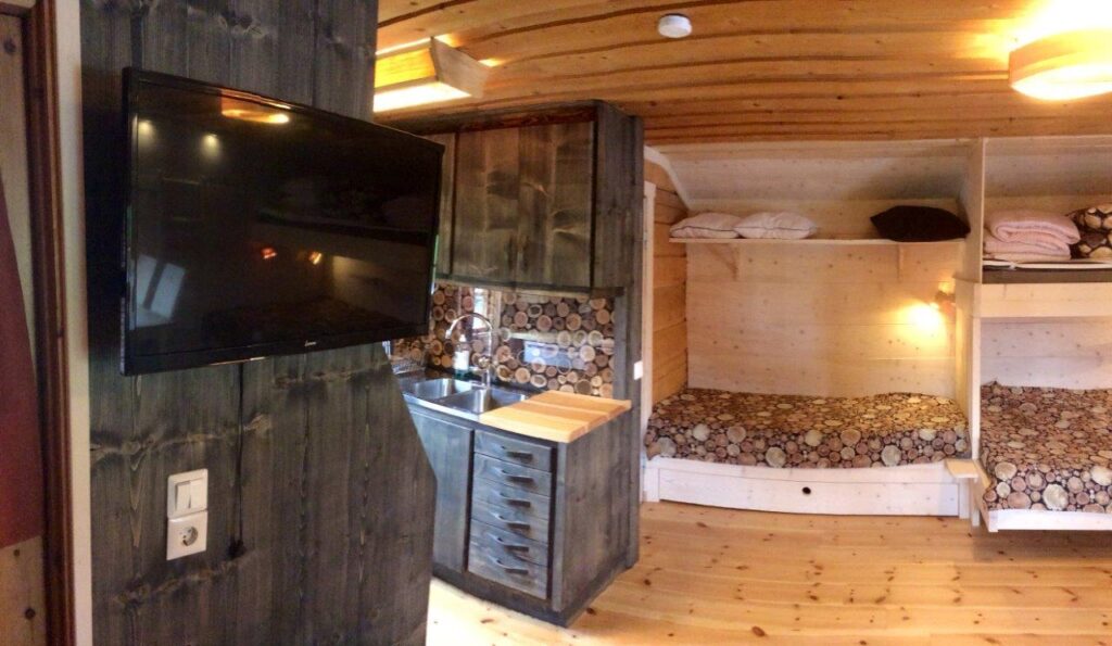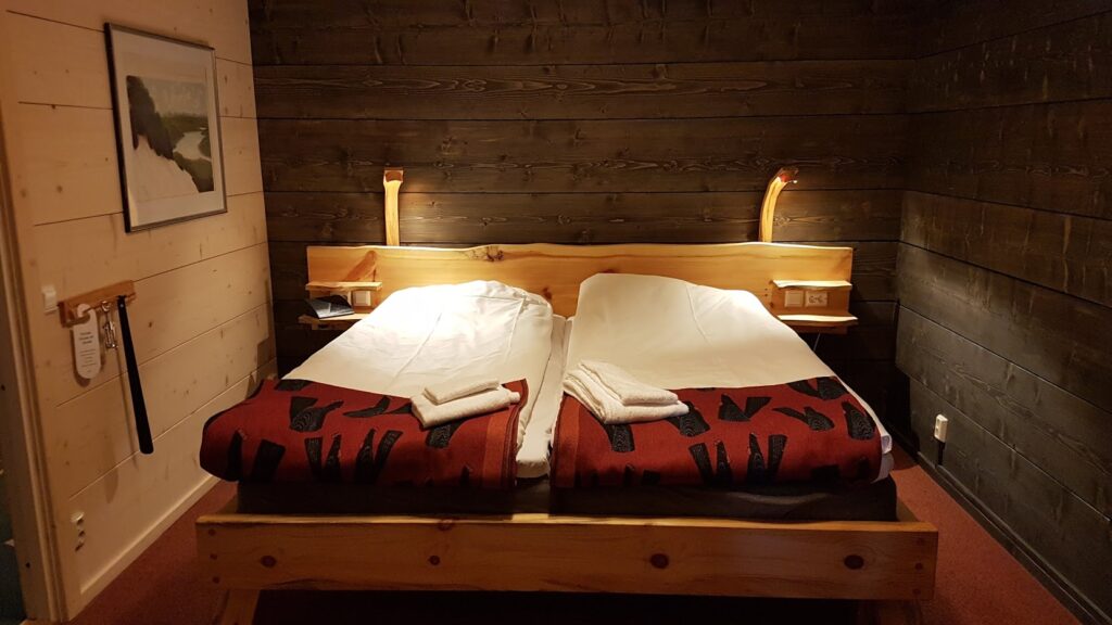 Hotellrum inredda med olika träslag. Denna bild från rummet med blånad fura.