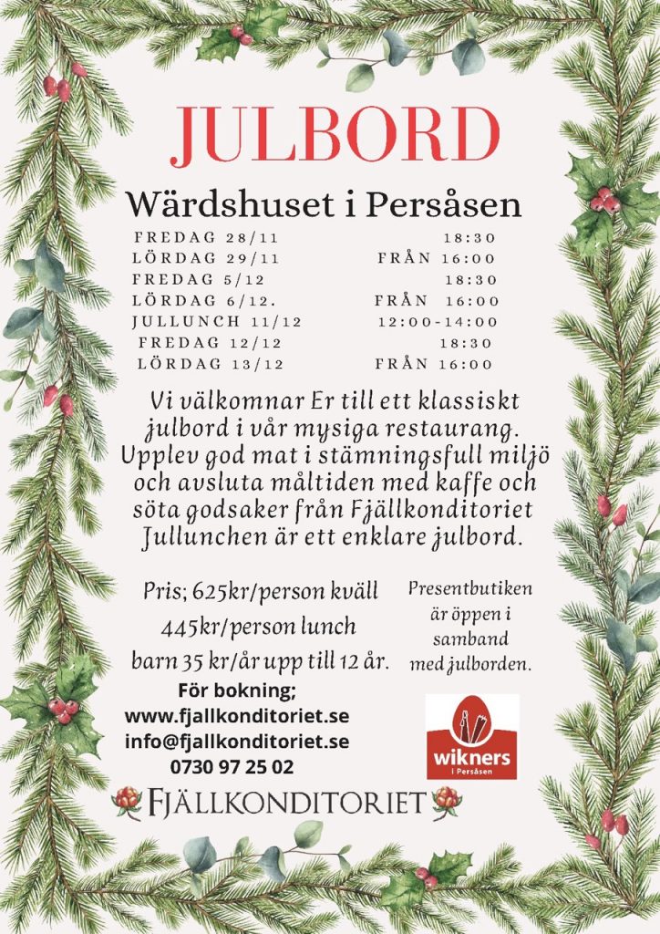 Söndagen den 26 februari 2023 utbröt en brand i vårt restaurangkök. Vi jobbade under nästan hela 2023 med återställningen och till julborden, som började i slutet av november, kunde vi öppna restaurangen igen. Under sommaren 2025 kommer allt att vara som vanligt igen, då vi kommer att ha öppet som vi brukar, med lunch och fika. Vår samarbetspartner på mat-och dryckessidan Fjällkonditoriet i Oviken kommer att annonsera och meddela olika evenemang mm på instagram/facebookkontot “wardshusetiPersasen” Följ dem gärna för att hålla er uppdaterade.